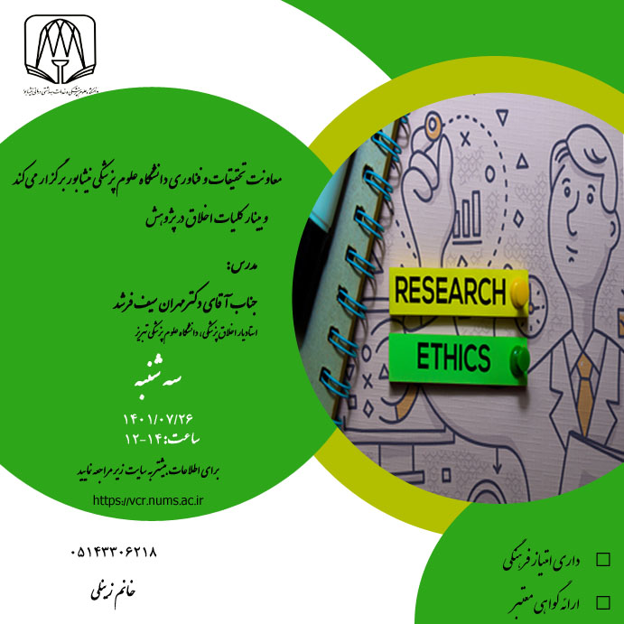 احتراما به استحضار می رساند، معاونت تحقیقات و فناوری دانشگاه علوم پزشکی نیشابور در نظر دارد وبیناری تحت عنوان   " کلیات اخلاق در پژوهش" را توسط استاد ارجمند جناب آقای دکتر مهران سیف فرشد در روز سه شنبه مورخ 26/07/1401 ساعت ۱۴-۱۲ برگزار نماید. لذا از کلیه اعضای محترم هیات علمی دانشگاه های علوم پزشکی دعوت می شود جهت ثبت نام و شرکت در کارگاه مذکور اقدام نمایند. لازم به ذکر است، شرکت در این وبینار دارای امتیاز فرهنگی می باشد. خواهشمند است مراتب به نحو مقتضی به اطلاع کلیه علاقمندان رسانده شود.